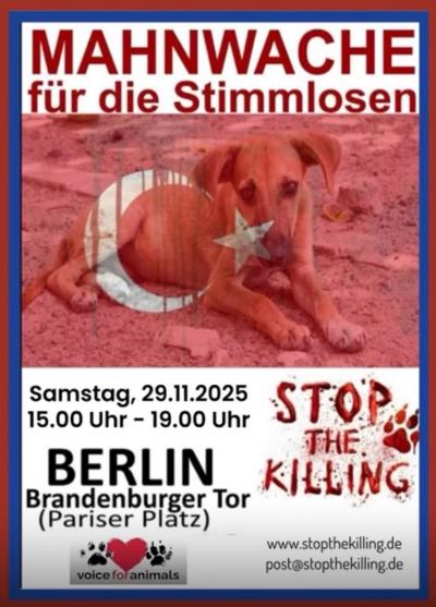 Am 29. November 2025 versammeln wir uns in Berlin zur großen Mahnwache von „Stop the Killing”. Gemeinsam mit vielen Vereinen, Initiativen und Unterstützern setzen wir ein starkes Zeichen gegen das staatlich orchestrierte Massaker an den Straßentieren in der Türkei.